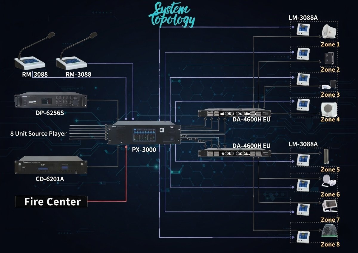 The PX-3000 system can be applied to public address system or commercial installation requirements that multiple audio sources need to be played simultaneously. The PX-3000 is suitable for the system whether the application is big or small. This system can be used on the high building, hotel, bus station, entertainment venues, hospital, convention center, restaurant, school, etc.